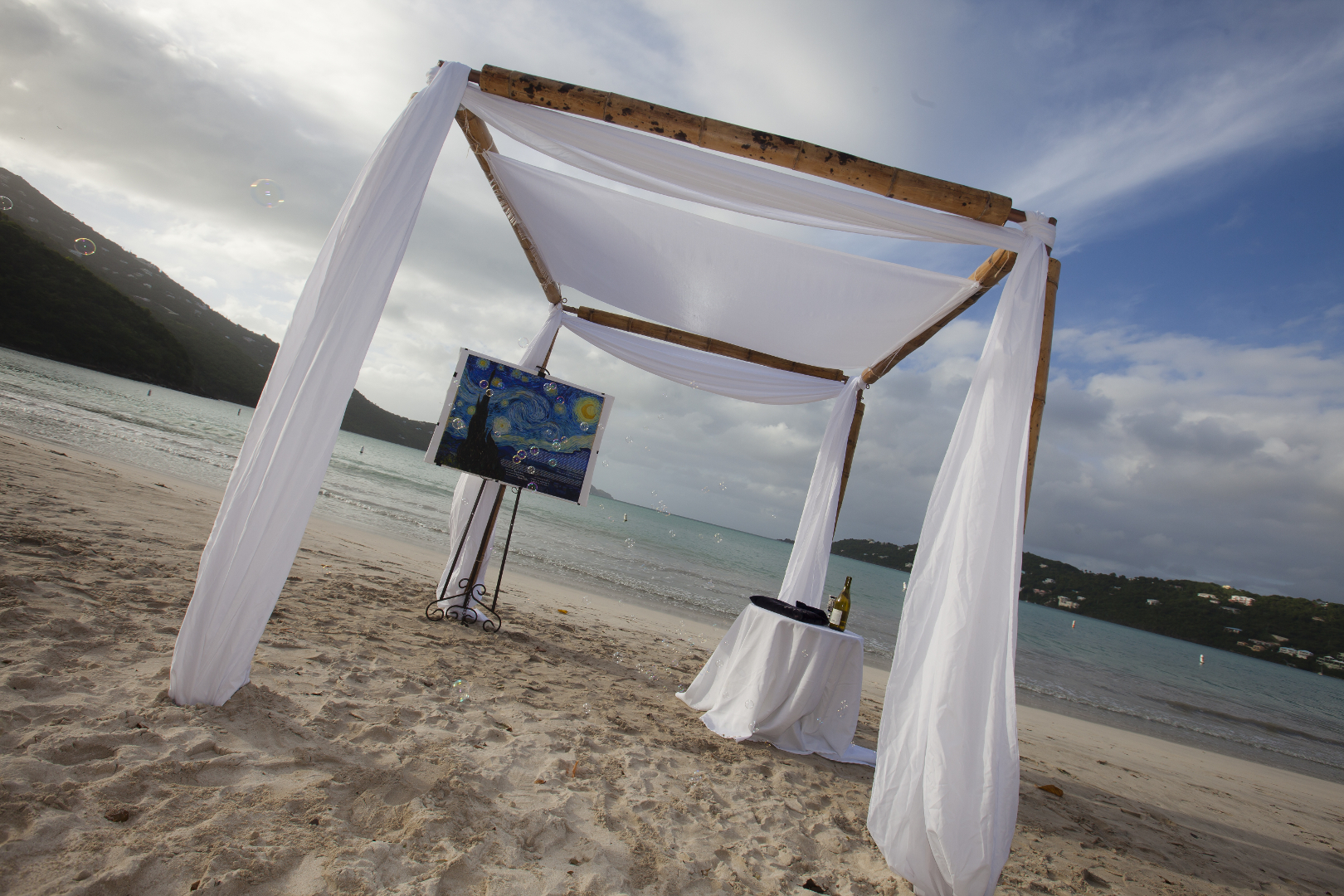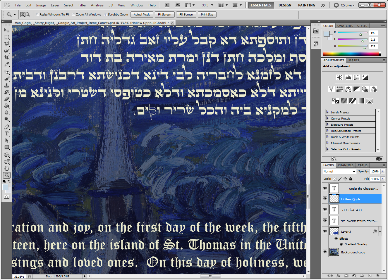 We love Van Gogh’s Starry Night and already had it hanging in our home. We didn’t really like any of the "standard" or even not-so-standard designs. So we decided we could make one ourselves, based on Van Gogh’s Starry Night, so we could enjoy the painting and celebrate our marriage for the rest of our lives. Select Your Art:First step is to select your art work and obtain a high resolution as possible. Best place to start is Google’s Cultural Institute where I found a high resolution version of Starry Night, accurate down to where the canvass peeks through and the paint with age has cracked and is available for download from Wikipedia. Get Your Text:We used Stephen P. Morse’s “Generating a Jewish Marriage Contract in One Step (A Do-It-Yourself Ketubah)” with confirmation from our Rabbi who was performing the ceremony that it was “kosher” (valid). Pick Your Font:We were making this Ketubah in the United States on an English (U.S.) Operating System with a great selection of English fonts but without many if any Hebrew fonts. For the English font we decided on Old English Text MT, a Microsoft font. We downloaded a selection of Hebrew fonts from the Open Siddur Project. We ended up choosing Shlomo Orbach’s Stam Ashkenaz (StamAshkenazCLM.ttf) because it supported Hebrew Cantillation Marks. Layout:We laid out the Hebrew and English text in a layer over the original painting artwork. We used Photoshop because GNU Image Manipulation Program (GIMP) had difficulty handling the Hebrew text. We used the Eyedropper tool to select the color for the text as a light shade from the existing work that would stand out but wouldn’t seem as foreign to the piece as a stark white would have. In order to improve the readability of the text we added a layer between the artwork and text with opacity.